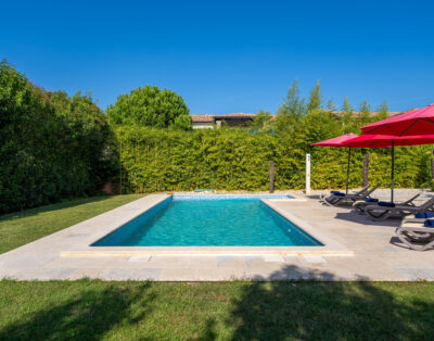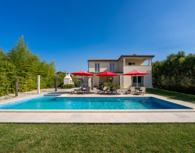 Villa Bincila is a paradise retreat in Kaštelir, Poreč, offering a luxurious haven for up to 12 guests. This modern 350m² villa, set within a sprawling 1,140m² fenced garden, features six spacious bedrooms, each creating a private oasis with en-suite facilities. Immerse in the breathtaking sea views from the balconies, and indulge in the comforts of home with a fully equipped kitchen, satellite TV, Wi-Fi, and air conditioning. Outside, the 40m² private pool, sunbeds, outdoor shower, and barbecue set the scene for an idyllic escape. Located just 9 km from the beach, this villa is perfect for families or groups seeking a tranquil yet sophisticated getaway in Istria